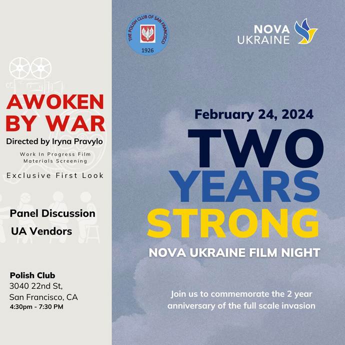 Moniuszko and SFPolskis (supports musicians and Group Muse) Mark Deutsch healing soundscape of Bazantar and Butoh Tickets: https://lu.ma/zmp59rck Please consider a donation to the Polish Club. SEE QR CODES AND DONATION BOX ON THE SHELF BEHIND THE BAR. Saturday, October 26, 2024: 5:00 PM Ukrainian Film Night Fundraiser by The Leleka Foundation (Supports Ukrainian