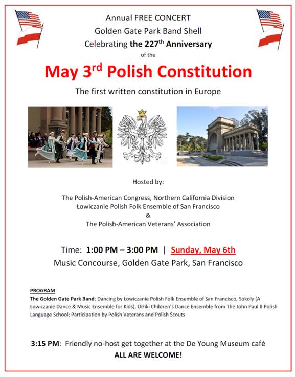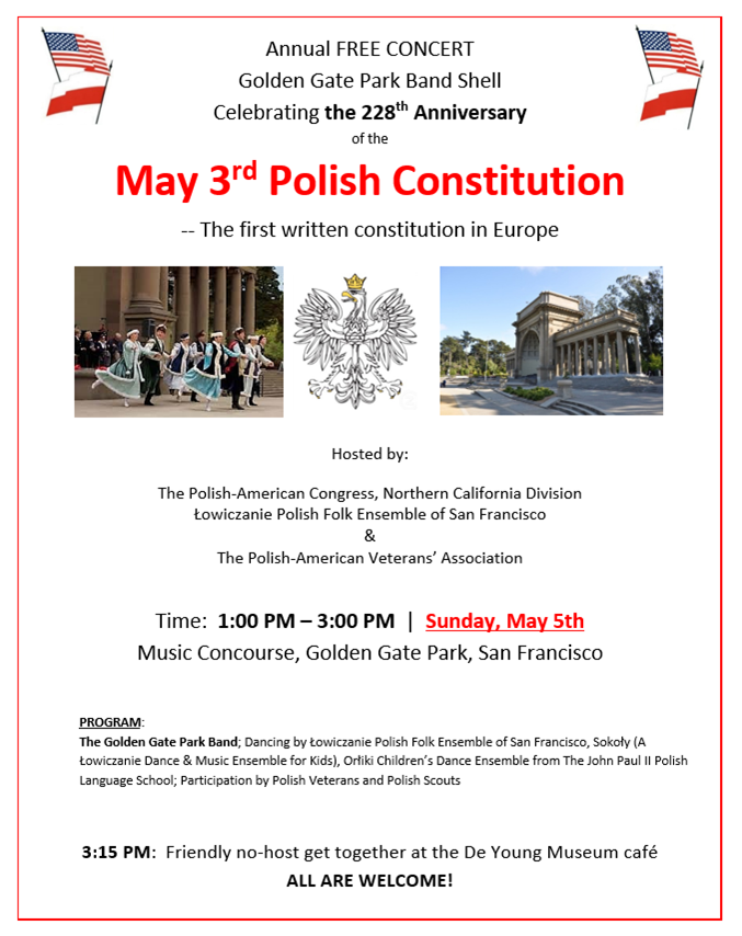Sunday, May 3, 2026: 1:00 PM Constitution Day, Golden Gate Park Bandshell Celebrating the Polish Constitution of 1791 since, at least 1951, at the